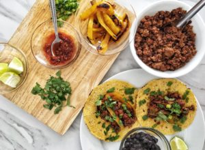 - Time to put your tacos together. Add a scoop of the chicken meat mix, then some yellow peppers, top with green onions and cilantro. Squeeze some lime and add the chili garlic sauce.