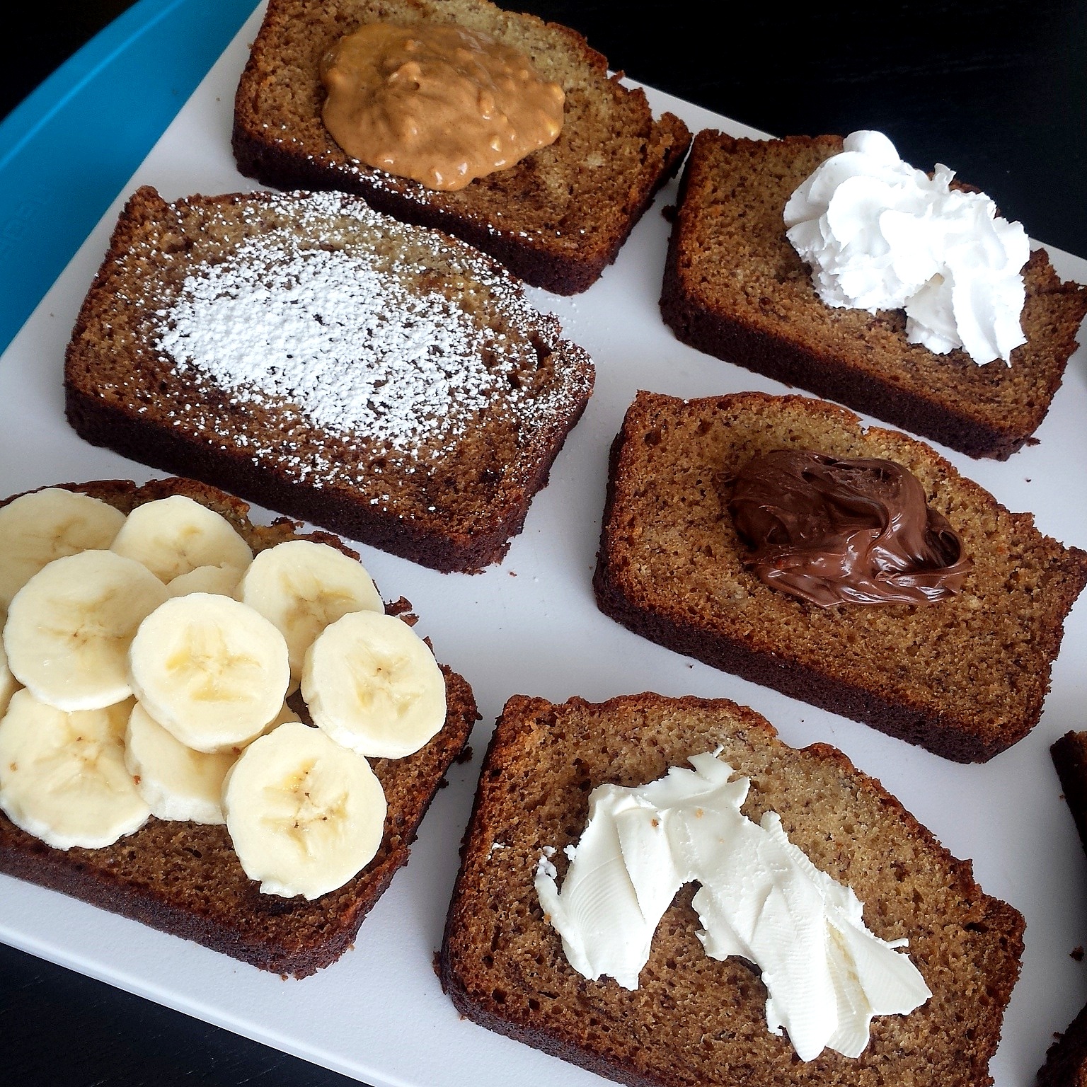 I couldn’t stop there. Next came powdered sugar, then peanut butter, whipped cream, Nutella and finally cream cheese. Oh, and are you ready to amp it up even more? Pop your banana bread slice in the toaster before adding a topping. DELICIOUS!
