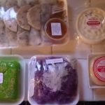 I was really surprised at the variety of goodies. I have a weakness for Asian sweets so I grabbed a little bit of purple colored sticky rice that came with a sugar/salt/peanut mixture that you sprinkle on top before eating, a few mung bean cakes (soft and hard) and a green colored sweet rice cake with mung bean in the middle.