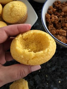 - Once the cornbread cupcakes are done cooking let them cool for just a few minutes. Then take a pairing knife and cut a hole in the top.
