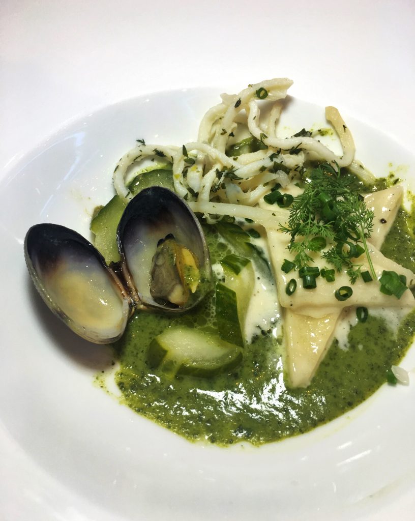 Fricassee of fish cake, oyster, clams and Korean seaweed with ceviche of dried squid.