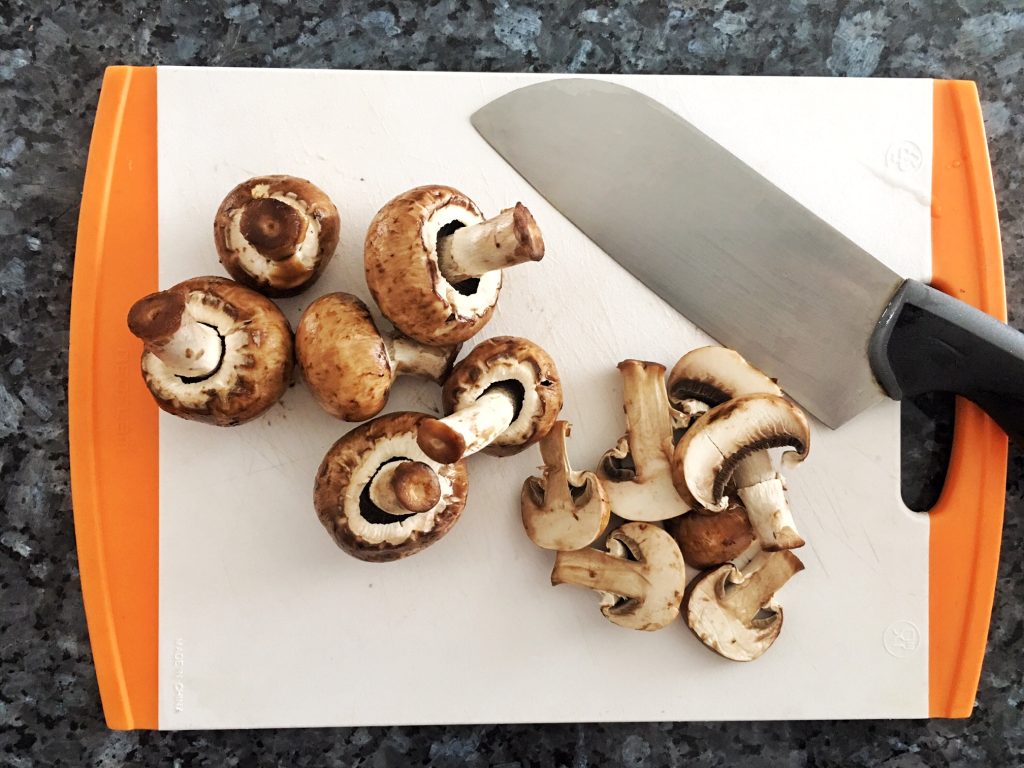 Slice up the mushrooms and sauté in olive oil. Don’t forget to wash them first even under the shrooms because there’s always a bit of dirt underneath.