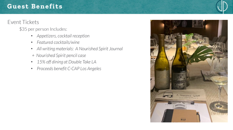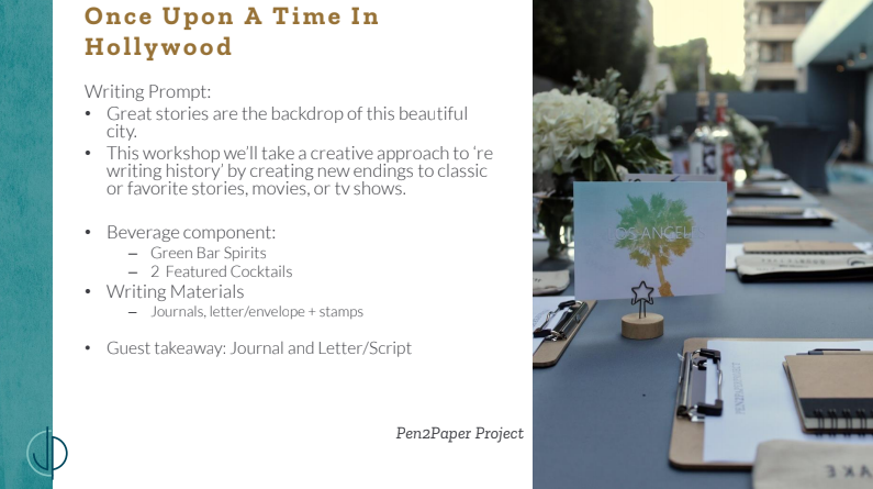 The evening starts inside The Kimpton Hotel Palomar Beverly Hills at Double Take with delicious craft cocktails and light bites. Followed by encouraging words and thoughts by creator Jayne Portnay to help get everyone adjusted to being in the moment. Then everyone gets settled in to begin to write, which forces the mind to change it’s “thinking” direction and lets the creative juices flow. The session will quiet your mind down just enough that it reminds you of how freeing writing (not typing) is. The next Pen2Paper event is coming up March 12th and the theme is “Once Upon A Time In Hollywood” and I’d love to see as many of you there as possible to share in this experience. Another benefit to attending is knowing a portion of the proceeds goes to benefit C-CAP Los Angeles, Careers through Culinary Arts Program.