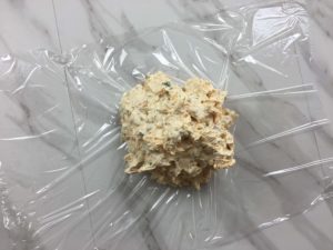 - Wrap the cheese in plastic and put it into the fridge for an hour. It needs to harden up.