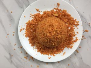 - Crush the Doritos into little bits. You are going to cover the cheeseball after it comes out of the fridge with the crushed Doritos which will make it look like a pumpkin.