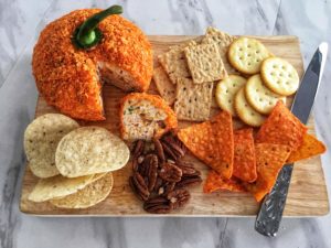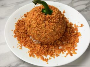 - Cut off the top of the bell pepper and put it on top of the pumpkin cheese ball.