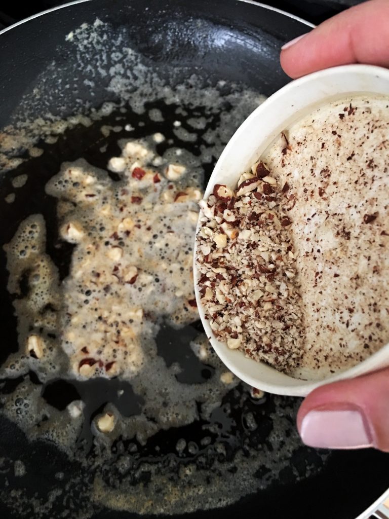 Let’s start by browning the butter. There’s a sweet spot in between butter in its solid state and what happens right before you burn the butter – BROWN BUTTER! You’re basically carmelizing (cooking) butter in a skillet over heat which gives it a nutty flavor and smell. You’ll start to smell it and trust me, you’ll know when you’ve reached brown butter status and you’ll definitely know if you’ve reached burnt butter status. You really have to watch it because once the butter starts to burn you basically need to start over unless you like the taste of burnt butter. No judgment here! 🙂 Add the crushed nuts once you’ve reached golden color status so everything can cook together for a few minutes and the nuts get roasted.