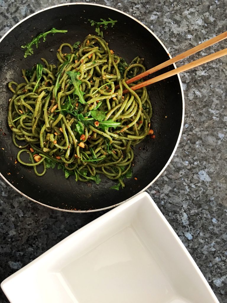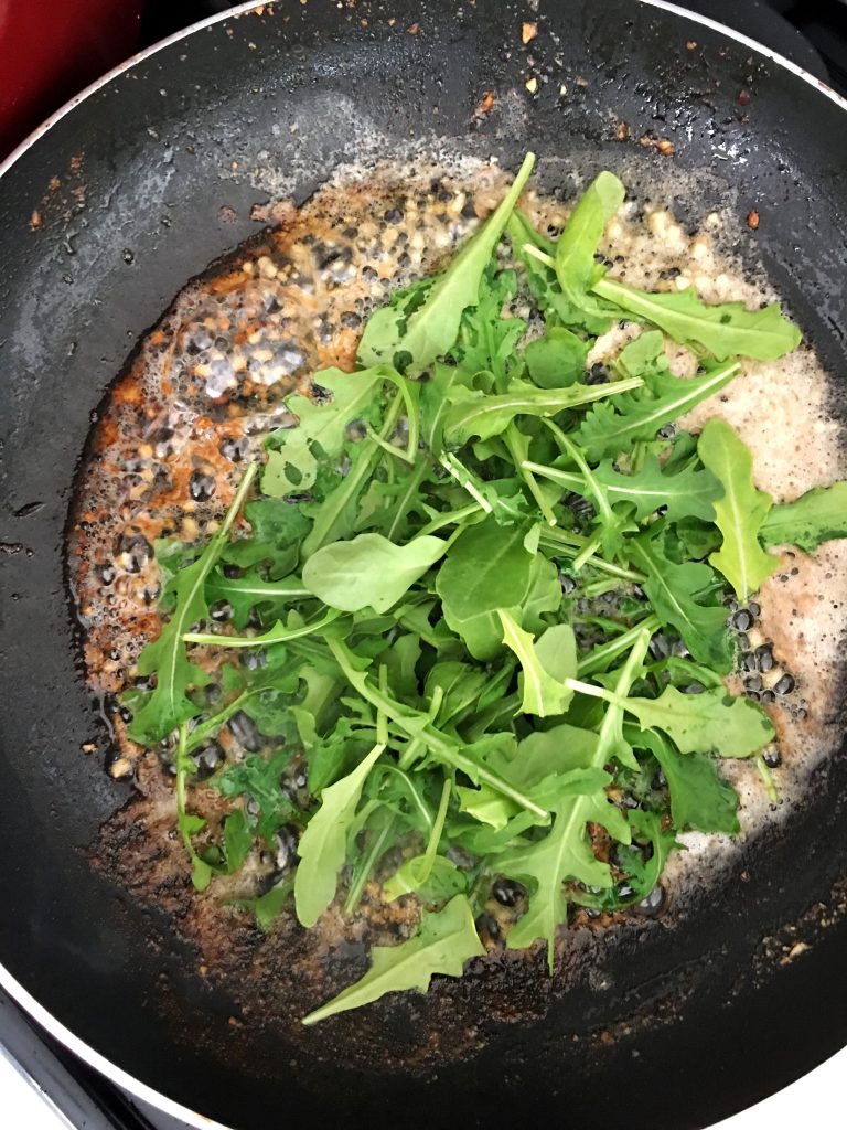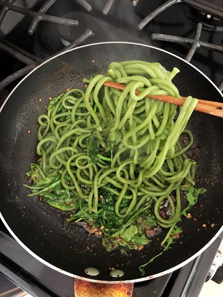 Next, I added a couple of handfuls of fresh organic arugula (another goodie from Milk and Eggs). I really like sneaking in veggies to my pasta dishes. It cooks down so much and incorporates so well that you don’t even realize they are in there but it adds an element of texture and color. You can also add spinach or kale. Clearly, I’m going for green on green on green. hahaha!