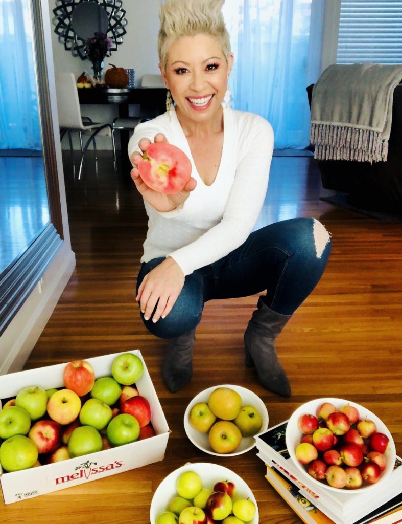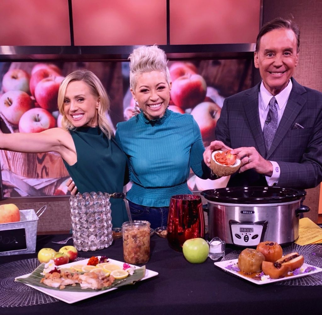 Funtimes back at KTLA for another culinary segment. This time it was all about apples. Did you know there are over 7000 apple varieties in the world? And over 2500 in the United States? I was super lucky (thank you Melissas Produce) to get my hands on the Hidden Rose varietal to share with the viewers. The Hidden Rose was discovered in the Pacific Northwest in the 60’s and while it looks like a regular light red apple the inside is a gorgeous fuschia color. During the segment I also covered the granny smith apple, the Lady Rose, the Crimson Golds and Ambrosias. Recipes included Apple Spiced Pancake with Apple Compote, Apple Gouda cheeseball wrapped in roasted and spiced pecans, Apple Relish, Stuffed Apples with a brown sugar drizzle and the Apple Noodle Healthnut Bowl.